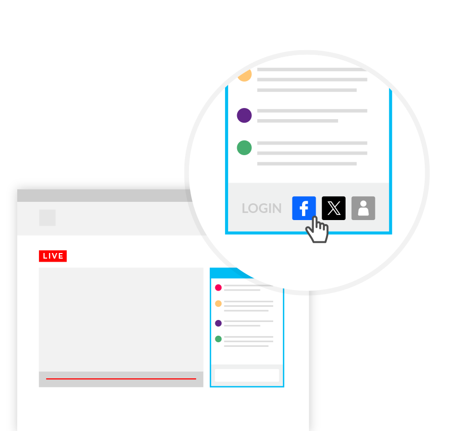 Give your audience a comfortable experience. Choose from a range of login options that best fit your and your audience's needs. Social Login makes event participation easy for users who already have social network profiles. Guest Login provides extremely low-friction, anonymous access. By giving your audience a choice of login options, they are more likely to engage with your event. A comfortable audience experience leads to greater engagement, and better results.