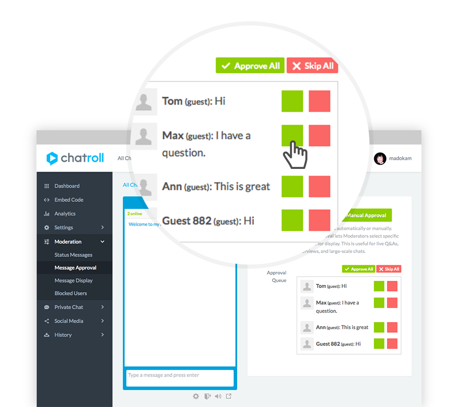 Create engaging Q&A sessions. Turn on Chatroll's powerful Q&A Mode to capture all questions and messages in a moderation queue. By capturing all questions before they go live to your audience, you are always in control of the discussion. Moderators can collaboratively review and select the best questions to get answered publicly. Chatroll makes it easy to review, select and dismiss questions, while keeping your audience involved and fully engaged.